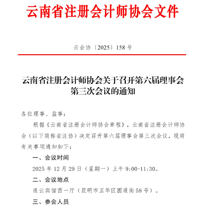 云南省注册会计师协会关于召开第六届理事会第三次会议的通知