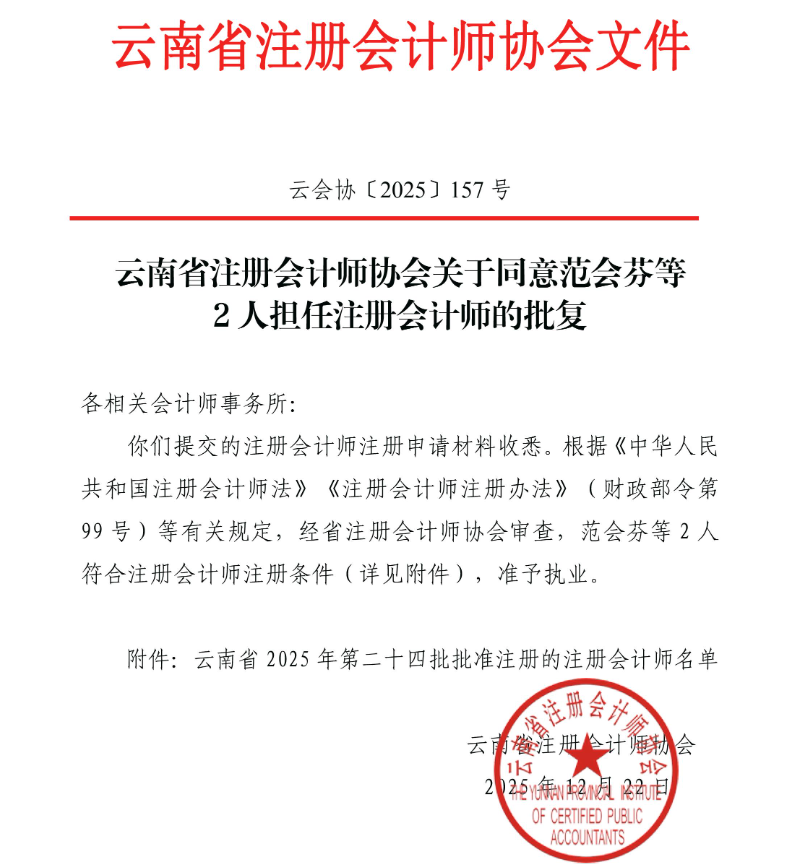 云南省注册会计师协会关于同意范会芬等2人担任注册会计师的批复