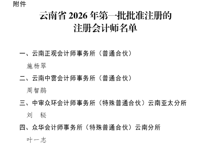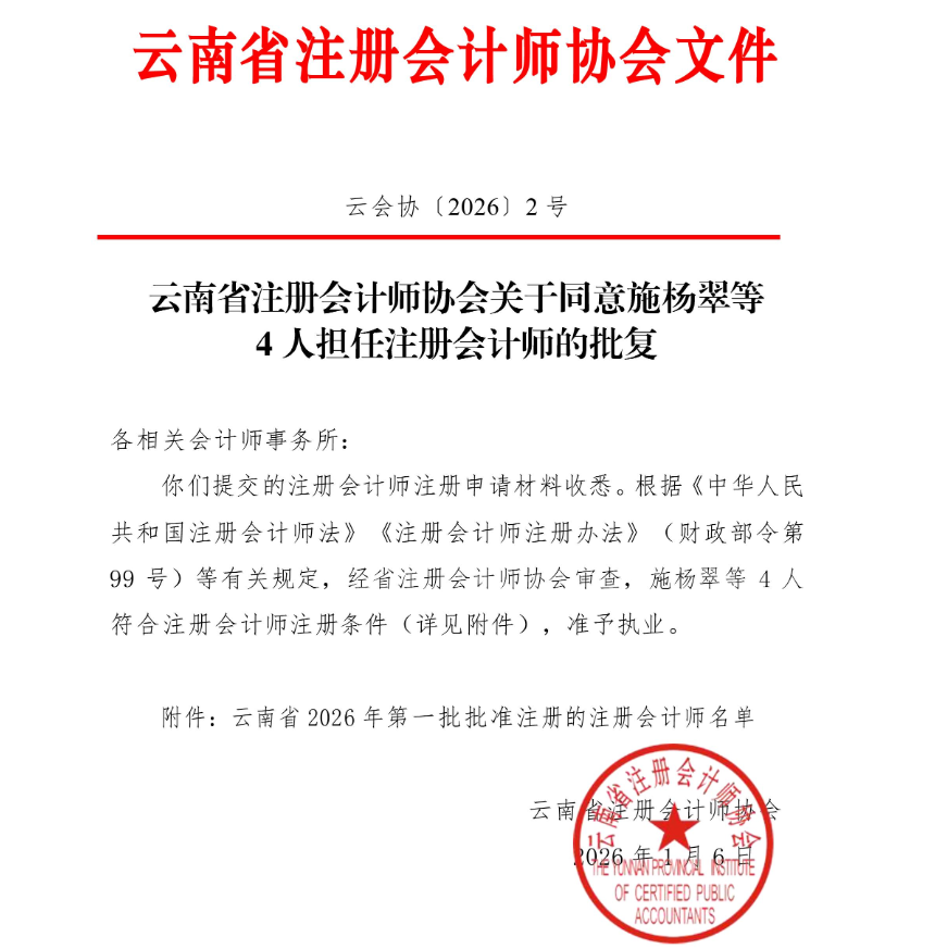 云南省注册会计师协会关于同意施杨翠等4人担任注册会计师的批复